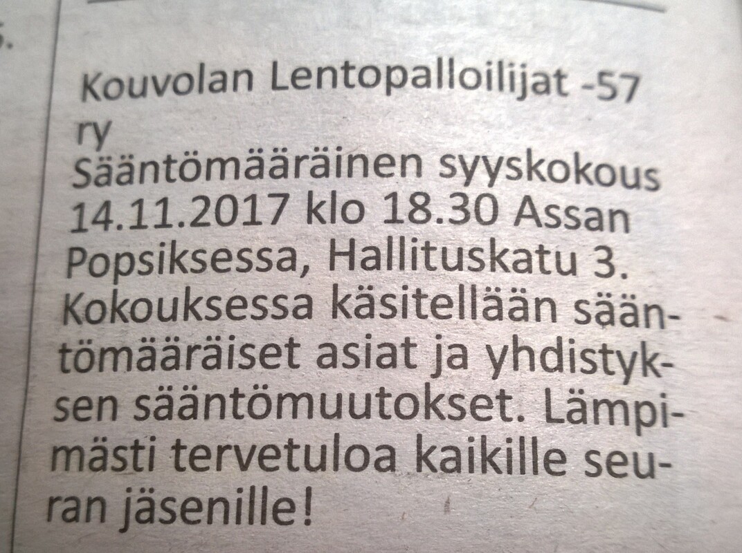Kouvolan Lentopalloilijat -57 ry:n syyskokous pidetään 14.11.2017 klo 18.30, paikka Assan Popsis, Hallituskatu 3, 45100 Kouvola. Käsiteltävät asiat: Sääntöjen muuttaminen (sääntöjen mukainen toinen käsittely) Sääntöjen mukaiset syyskokousasiat, mm toimintasuunnitelman ja talousasrvion hyväksyminen sekä henkilövalinnat tulevalle toimintakaudelle.
