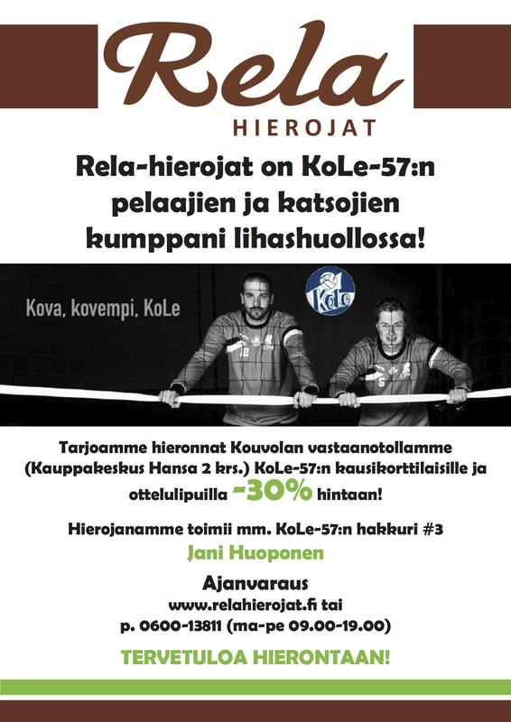 Kauden 2016-2017 ensimmäinen yhteistyösopimus on solmittu Kouvolan Lentopalloilijat -57 ja Rela-hierojien välillä. Maaliskuusta lähtien Rela-hierojat vastaavat edustusjoukkueen lihashuollosta, jotta pelaajamme pystyvät harjoittelemaan entistä ammattimaisemmin, sekä ennaltaehkäisemään urheiluvammoja! Rela-hierojat on menestynyt eteläsuomalainen hierontaketju, jonka pääkriteereinä toimivat laatu ja asiakkaan tyytyväisyys. "Me uskomme siihen, että hyvinvoinnin pitää olla jokamiehen ja -naisen oikeus, ei etuoikeus. Siksi Rela-hierojat on olemassa." Rela-hierojat ovat ensimmäinen kanta-asiakkuudella toimiva hieronta-alan yritys Suomessa. Tutustu kanta-asiakaskorttiin linkin kautta: Relakortti Maaliskuusta lähtien myös joukkueen kausikorttilaiset ja kannattajat pääsevät nauttimaan klassisesta- tai urheiluhieronnasta -30% alennuksella kokonaishinnasta!! Rela-hierojat tarjoavatkin siis myös kaikille lentopallon ystäville ja KoLe-57 kannattajille Kouvolan halvimmat hierontahinnat. Kauden 2015-16 kausikortit toimivat alennuskorttina niin kauan kun tulevan kauden (2016-17) kausikortit tulevat markkinoille! Hyödynnäthän etusi! Kun ostat kauden 2016-17 kausikortin, saat oikeuden allaoleviin hinnanpudotuksiin: